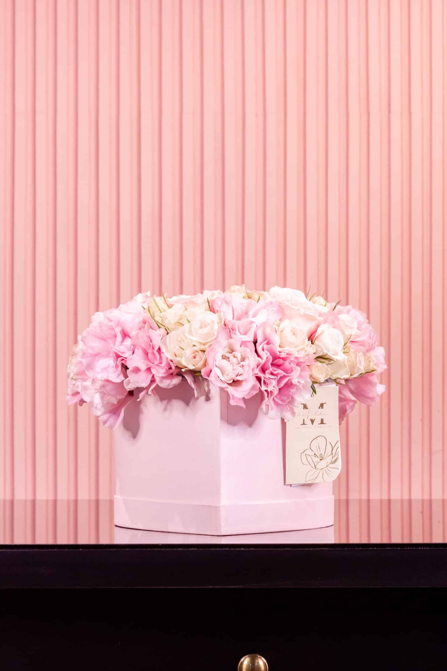 Selección de flores en tono pastel como rosas, baby rose, lisianthus colocados en caja tono pastel con vista 360º.