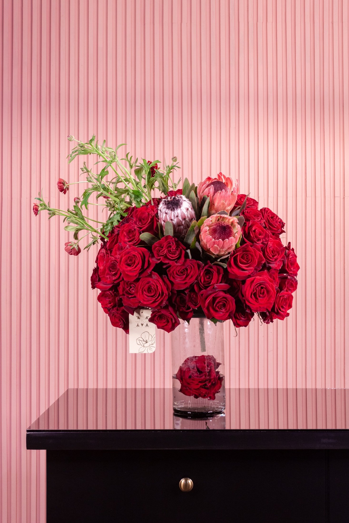 Topiario en cilindro de cristal a base de rosas color vino colocadas en distintas profundidades y acentuado en flores finas como proteas y ranunculus color vino. Este arreglo tiene 360º de vista.