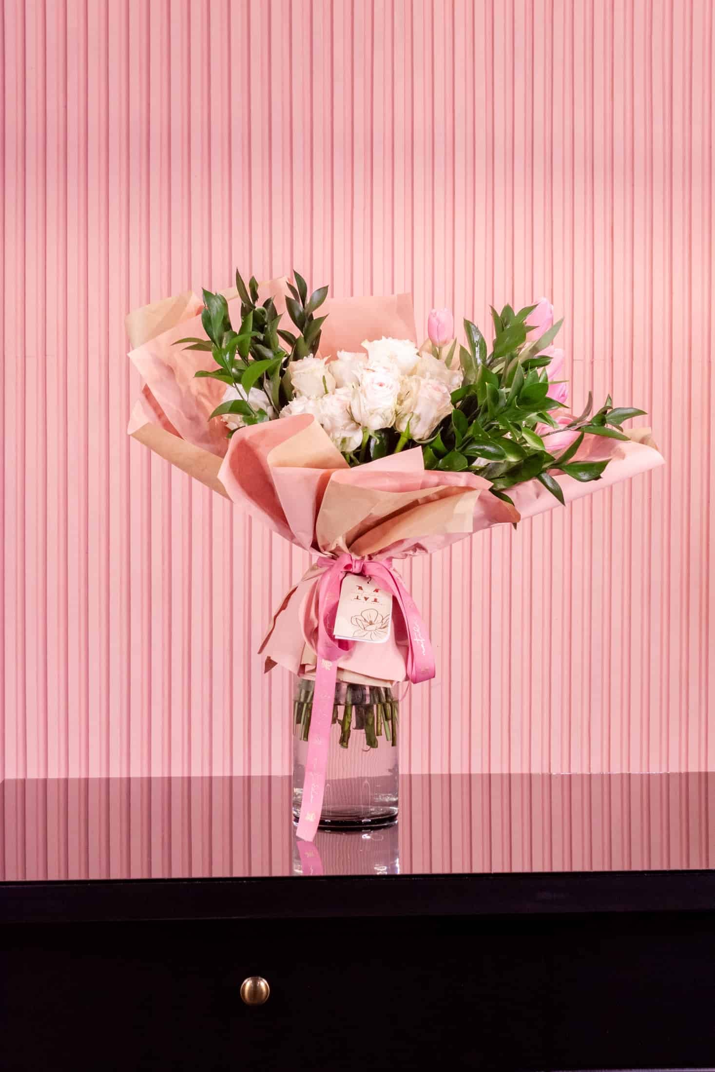 Bouquet de 24 rosas envuelto en papel tonos nude y rosa con agrupaciones de ruscus y toques de flores finas.