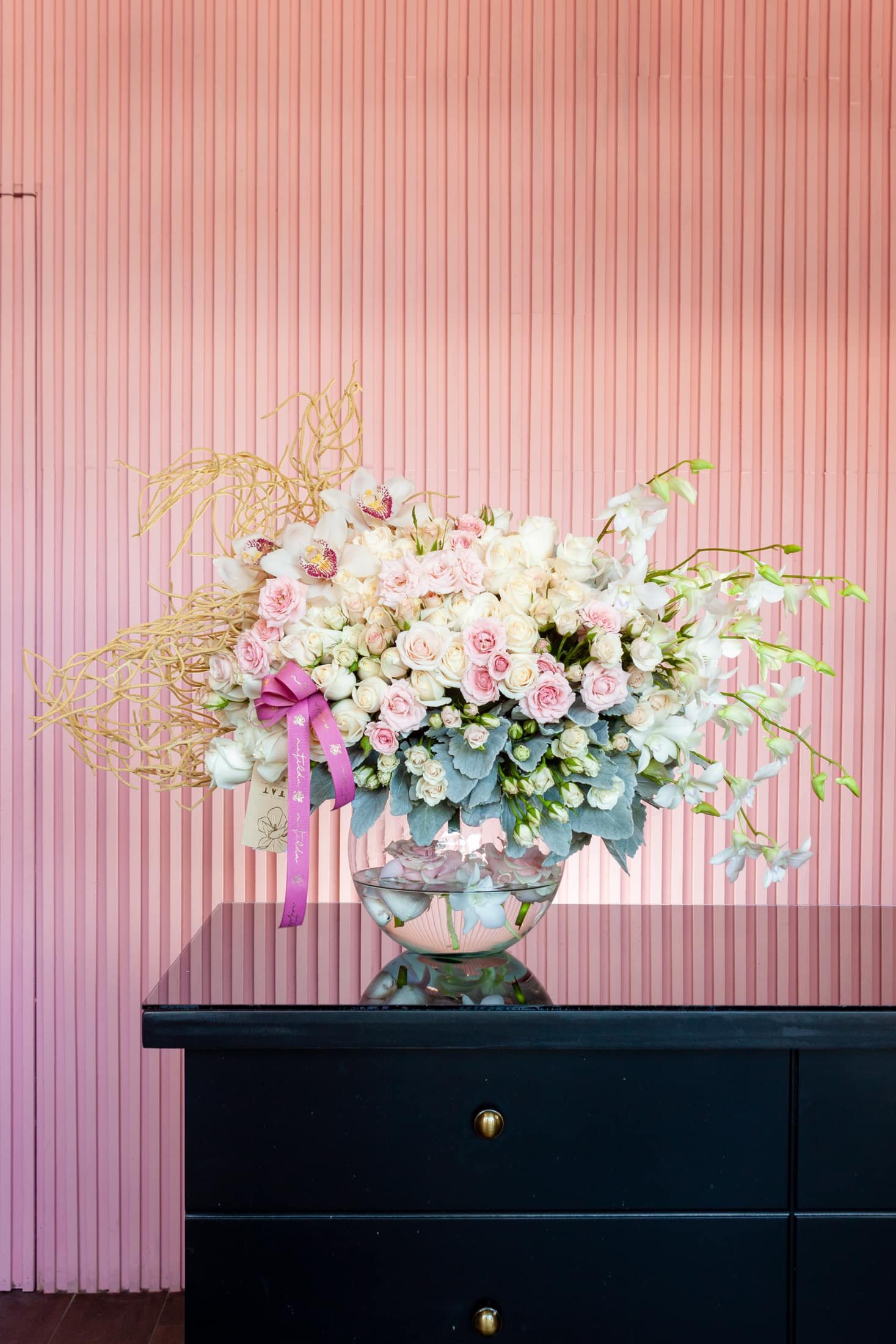 Arreglo a base de rosas y baby rose en tono blanco-rosa pastel texturizado con hojas terciopelo color gris y acentuado con flores finas en variedad de orquídeas. Colocado en una esfera de cristal con rosas sumergidas.